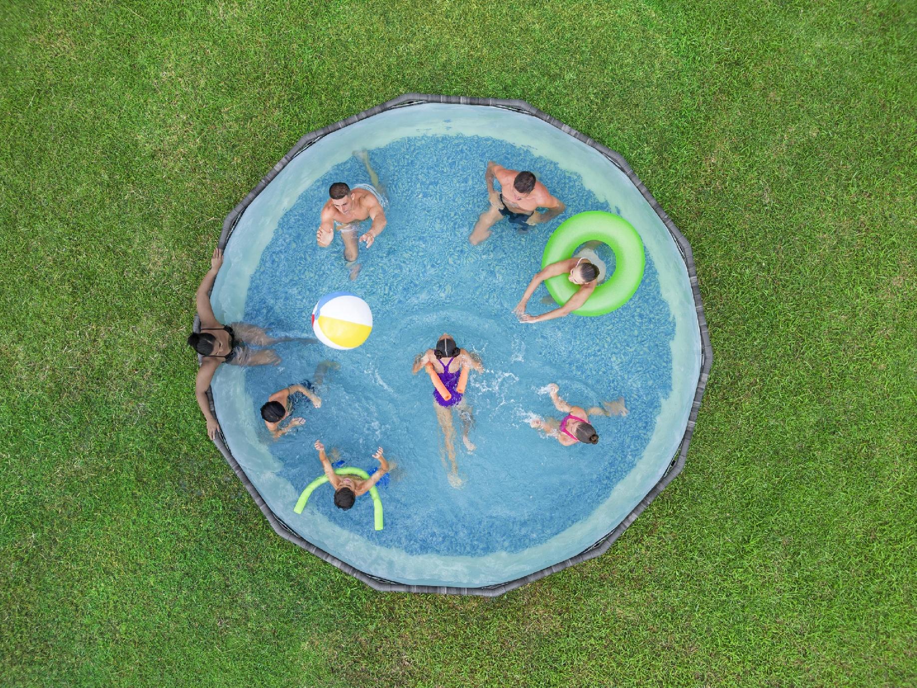 - Okrągły kształt basenu zapewnia łatwą instalację, zwiększoną stabilność i większą przestrzeń ze względu na fakt, że basen nie wymaga bocznego wsparcia