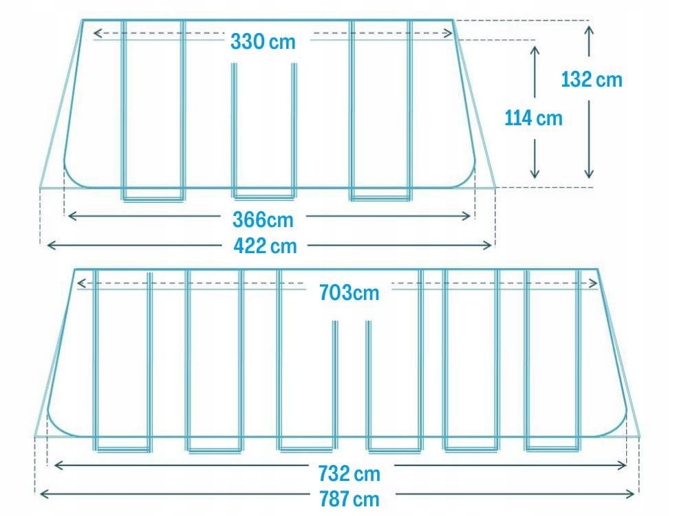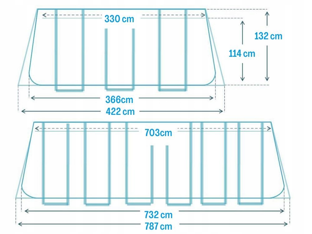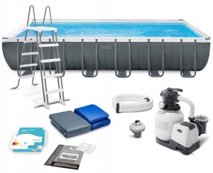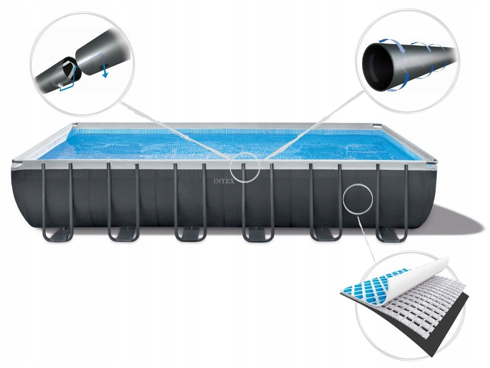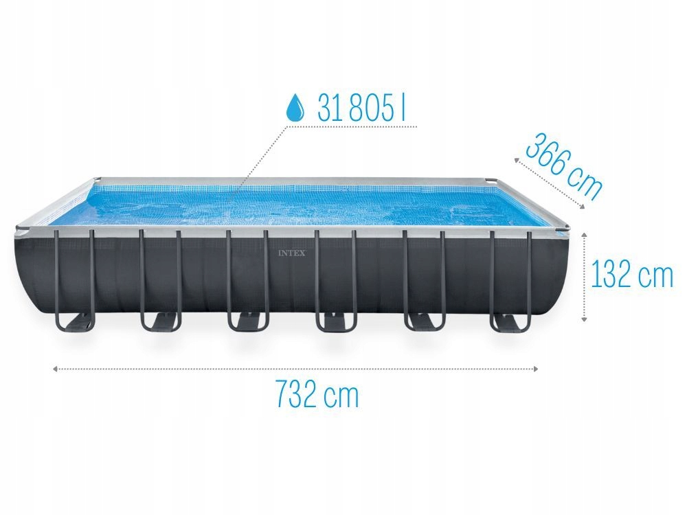 1. BASEN STELAŻOWY - basen Ultra XTR Rectangular Frame firmy Intex o rozmiarze 732 cm x 366 cm x 132 cm - pojemność 31 805 l. Producent wskazuje wypełnienie wodą, maksymalnie na poziomie 90%. Czas montażu zajmuje około 60 minut.