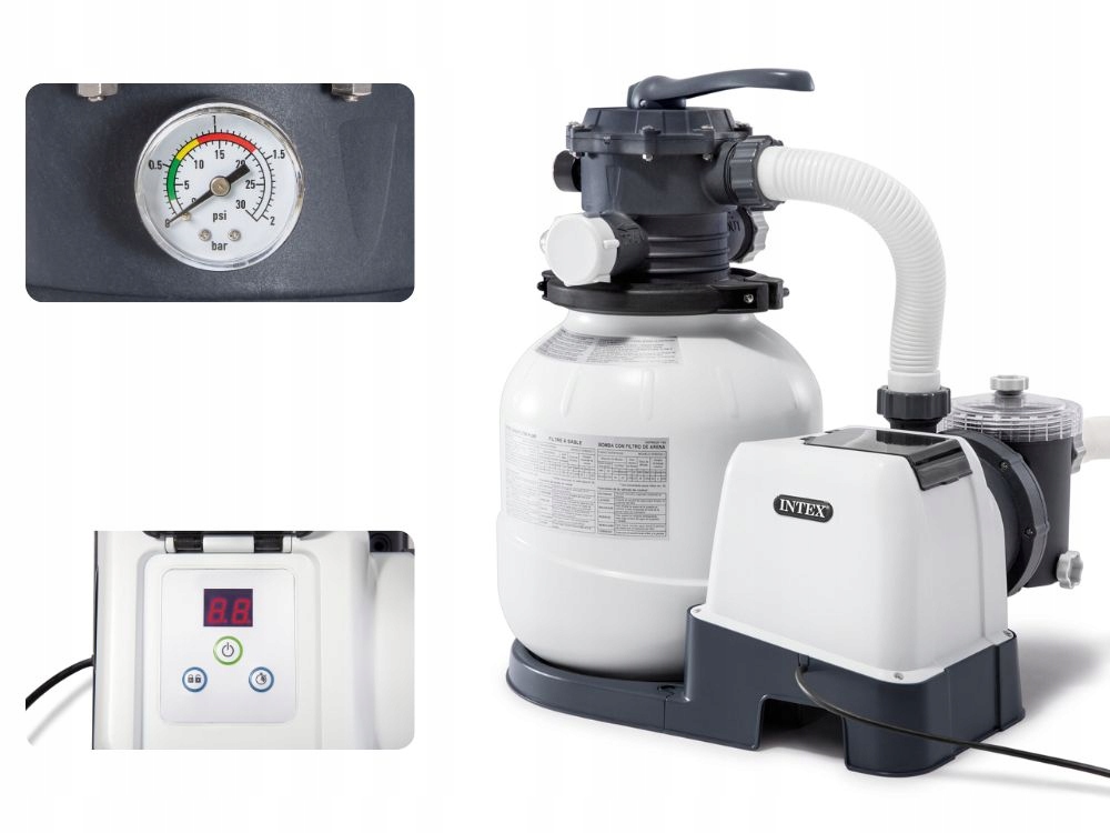 2. POMPA BASENOWA - elektryczna pompka piaskowa filtrująca toń wody z wszelakich zanieczyszczeń o wydajności 7 900 l/h. Do sprawnego działania pompa potrzebuje 23 kg piasku o ziarnistości 0,4 - 0,8 bądź 16 kg szkła kwarcowego. Podczas działania pompy nie należy korzystać z basenu. Załączone akcesoria do pompy to rury oraz złączki. Przed zainstalowaniem pompy, koniecznie zapoznaj się z jej instrukcją obsługi.