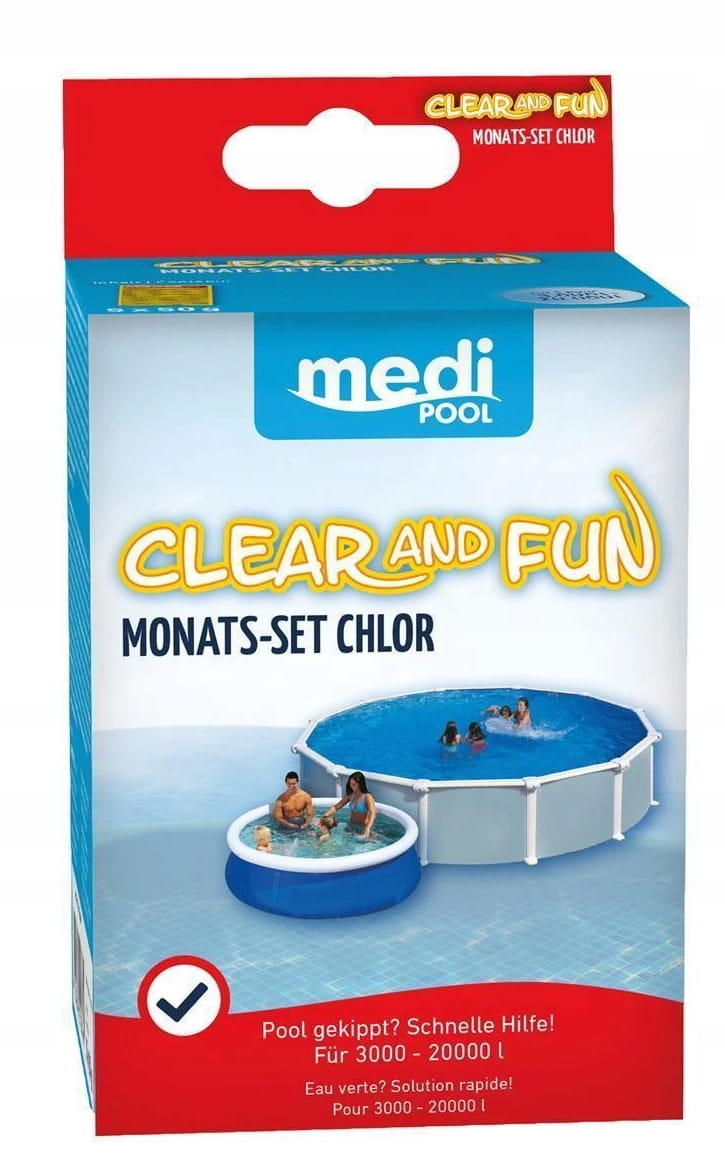 Dzięki miesięcznemu zestawowi „Clear and Fun” możesz utrzymać swój basen przez 4 tygodnie. Granulki zawierające chlor dezynfekują wodę i utrzymują ją wolną od zanieczyszczeń. Ten produkt szybko pomaga nawet w przypadku stojącej wody dzięki specjalnemu usuwaniu mętności. W mgnieniu oka znów będziesz mieć czystą wodę. Opakowanie zawiera 5 tabletek po 50 g, odpowiednich do basenów o pojemności 3000–8000 l.