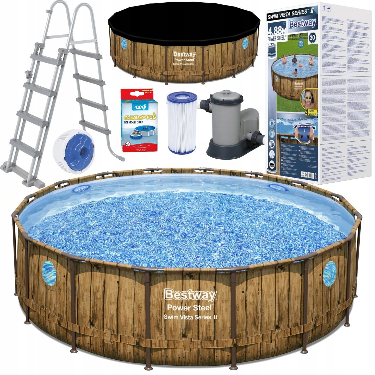 - Zawiera drabinkę zabezpieczającą o wysokości 122 cm ułatwiającą wejście do wody