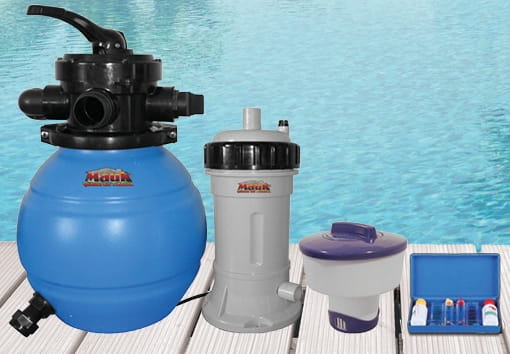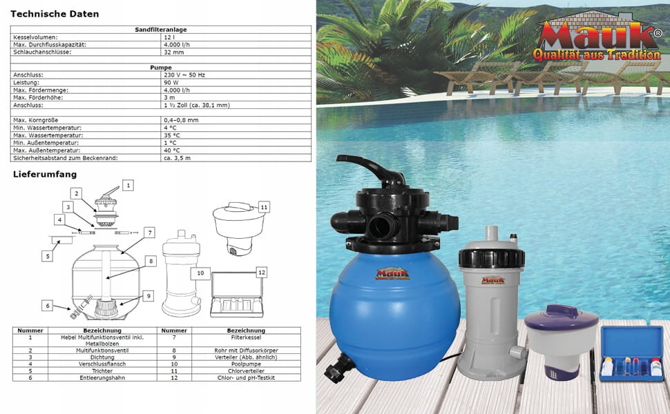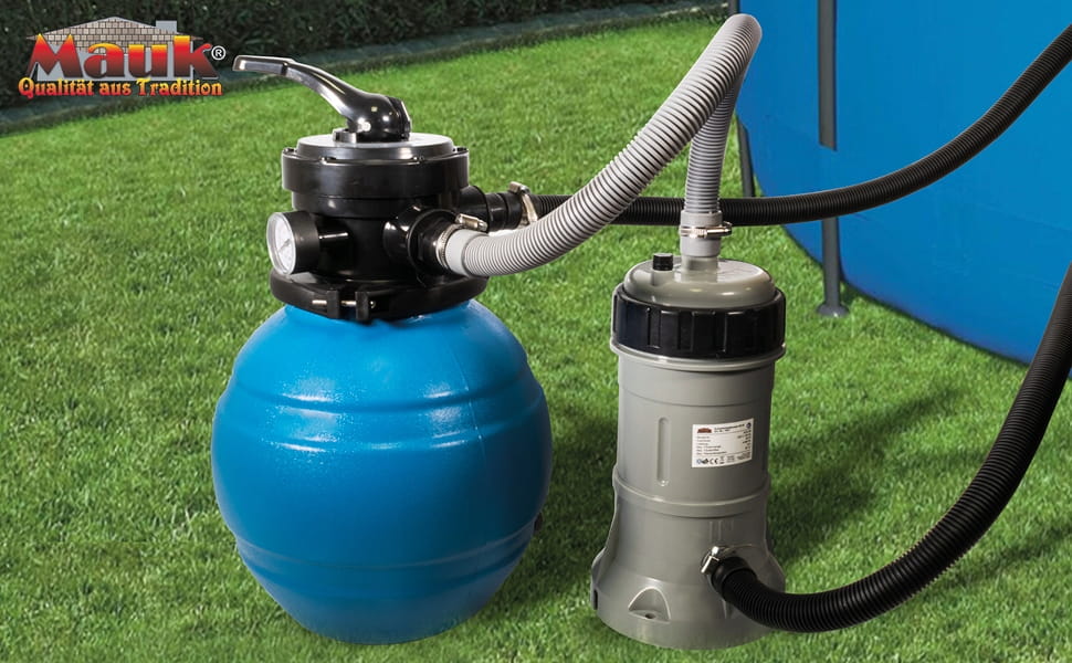 Nadaje się do wszystkich powszechnie stosowanych basenów do 18 m³. Wyposaż swój basen typu quick-up, basen ramowy, basen ze stalową ścianką lub basenem ze stali nierdzewnej, a także szybko i łatwo swój staw do pływania w filtr piaskowy MAUK. Po rozłożeniu urządzenia można ustawić na ok. 3-4 m od basenu na stabilnym i równym podłożu. W celu ochrony i pięknego wyglądu zaleca się zbudowanie chronionej pozycji (schronienia) dla instalacji filtra piaskowego. Praktyczna: W zakres dostawy wchodzi również rozdzielacz chloru i zestaw testowy