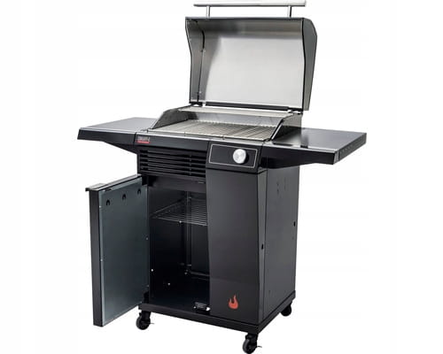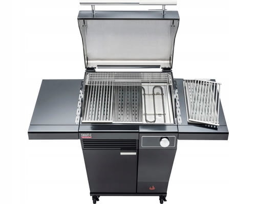 - Boczne półki stylowego, czarnego grilla są składane, a tam, gdzie zazwyczaj znajdowałaby się butla z gazem, SMART-E oferuje miejsce do przechowywania przyborów kuchennych. Dzięki MADE2MATCH możesz dostosować i rozbudować swój grill. A jeśli kiedykolwiek zajdzie potrzeba przestawienia SMART-E, z łatwością przesuniesz go z punktu A do punktu B na czterech wytrzymałych kółkach.
