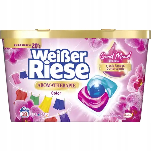 Weißer Riese Colorwaschmittel potrójne kapsułki do prania orchidea to innowacyjne kapsułki do prania kolorowych tkanin, które łączą skuteczność czyszczenia z przyjemnym zapachem orchidei. Dzięki trójfazowej formule zapewniają głębokie czyszczenie, ochronę kolorów i długotrwałą świeżość.