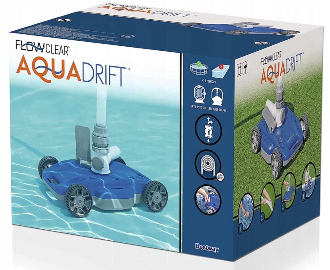Półautomatyczny odkurzacz basenowy Bestway Flowclear AquaDrift jest świetny ze względu na swoją prostą obsługę. Odkurzacz działa tylko wtedy, gdy jest podłączony do pompy filtrującej, która musi mieć minimalny przepływ filtra wynoszący 5678 litrów na godzinę. Wydajność czyszczenia zależy od wydajności filtracji, im wyższa wydajność filtracji, tym skuteczniejsze będzie odkurzanie, ale zalecany jest maksymalny przepływ filtracji wynoszący 12113 litrów na godzinę. Odkurzacz przeznaczony jest do basenów naziemnych z kwadratowym lub okrągłym dnem. Wystarczy go podłączyć, włączyć, a odkurzacz sam się wszystkim zajmie. Produkty firmy Bestway spełniają najsurowsze normy bezpieczeństwa dotyczące przetwarzania i stosowanych materiałów.