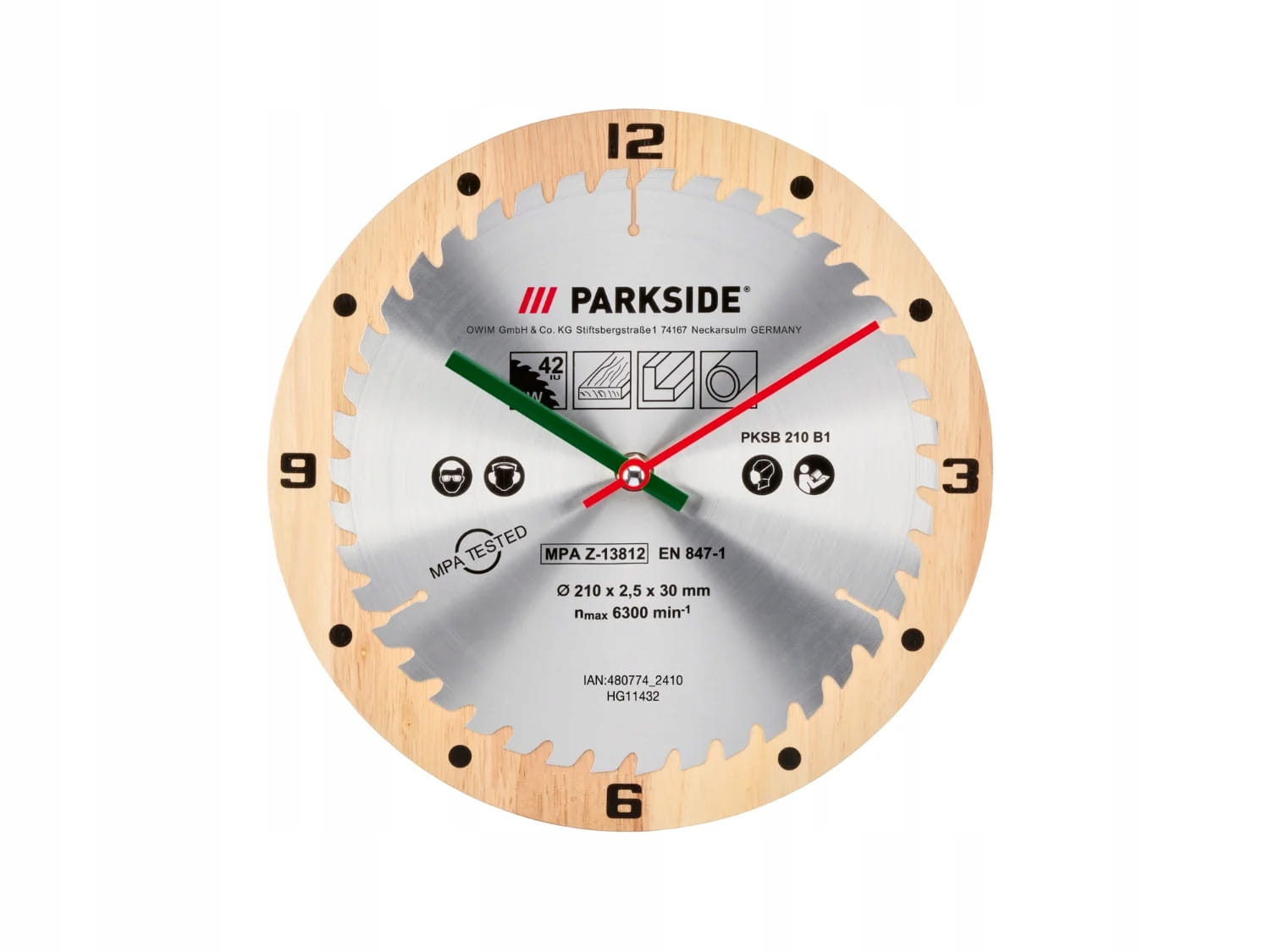 - Zabarwienie: Tarcza: drewno, ostrze piły: srebro, wskazówka godzinowa: zielona, wskazówka minutowa: czerwona