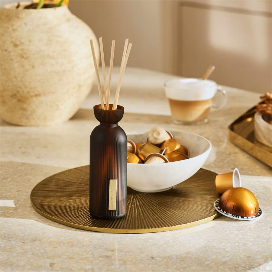 Patyczki zapachowe Ritual of Mehr marki RITUALS to stylowy sposób na dodanie wyjątkowego charakteru każdemu wnętrzu. Doznania zapachowe koncentrują się na połączeniu słodkiej pomarańczy z drzewnym ciepłem drewna cedrowego. Uzupełnione rozgrzewającymi przyprawami, kwiatowymi akcentami i nutą gałki muszkatołowej, aromat tworzy świeżą, a zarazem przyjazną atmosferę. Elegancki design pałeczek idealnie wpasowuje się w różnorodne style wnętrz. Są łatwe w użyciu: wystarczy włożyć patyczki do butelki, aby uwolnić zapach w sposób ciągły; nie jest wymagane przekręcanie. W zależności od intensywności użytkowania i rozmiaru produktu, zapach może wystarczyć na około trzy do sześciu miesięcy. Wkłady uzupełniające do płynu zapachowego i nowych pałeczek są dostępne osobno, co pozwala na dalsze korzystanie z butelki.