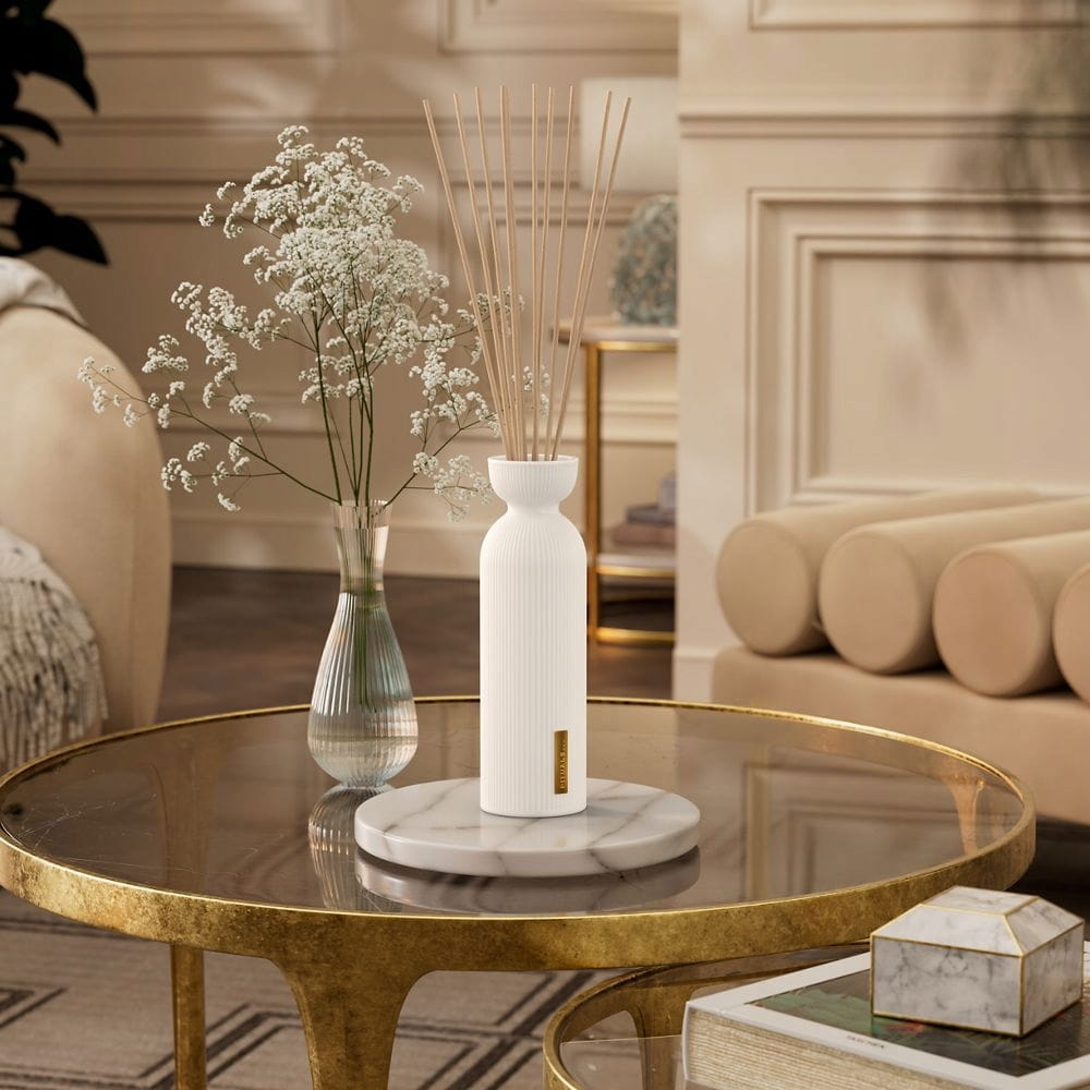 Patyczki zapachowe Ritual of Karma marki RITUALS tworzą wyjątkowo przyjemną atmosferę w każdym domu. Zapach do pomieszczeń charakteryzuje się świeżym i eleganckim charakterem, przywodzącym na myśl beztroski letni dzień. Sercem kompozycji są delikatne aromaty białej herbaty i kwiatu lotosu. Zapach otwiera się musującą nutą głowy z bergamotki i cytryny, która łączy się z kwiatowym sercem z kwiatu pomarańczy i bzu. Nuta bazy z miękkiego piżma i ciepłego drzewa sandałowego nadaje zapachowi subtelną głębię i harmonijnie go dopełnia. Drewniane patyczki zapachowe równomiernie i równomiernie rozprowadzają aromat w pomieszczeniu, zapewniając doznania zapachowe trwające tygodnie. Stylowo zaprojektowany biały flakon to nie tylko dyfuzor zapachowy, ale także dyskretny i dekoracyjny dodatek, który dopełni każdą przestrzeń życiową.