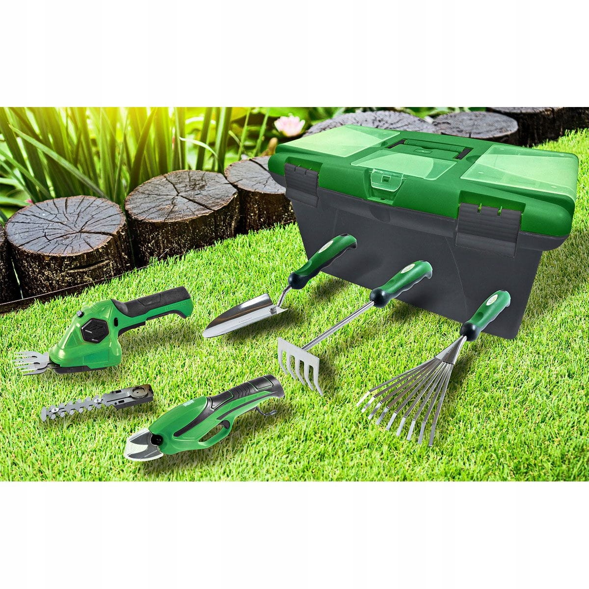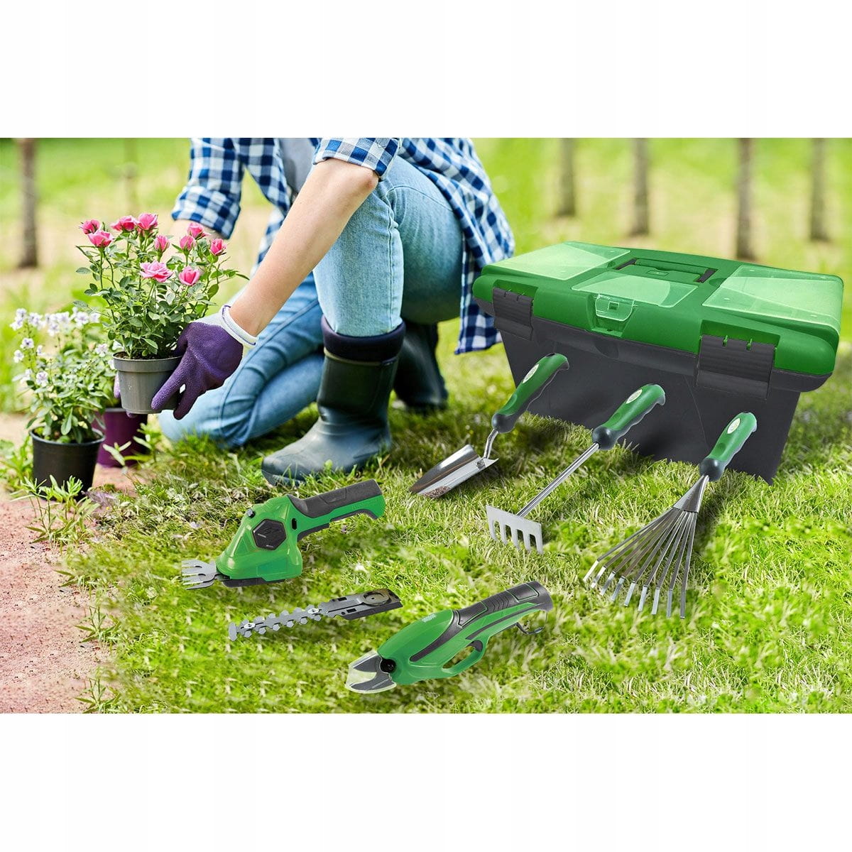 Garden box zapewnia wszystko, czego potrzebujesz do utrzymania ogrodu. Box zawiera bezprzewodowe nożyce do przycinania, bezprzewodowe nożyce do trawy i krzewów, a także dwie grabie i łopatkę do kwiatów.