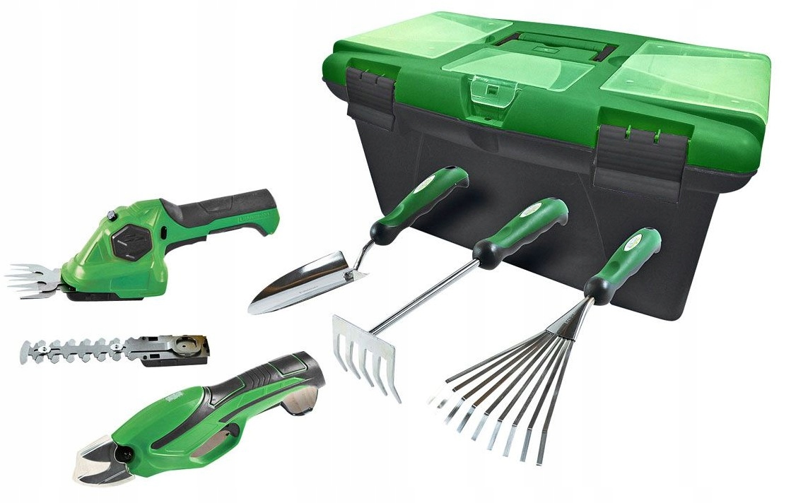 - - Zakres dostawy: 1x akumulatorowe nożyce do przycinania 4V, 1x akumulatorowe nożyce do trawy i krzewów 4V, 2x grabie, 1x łopatka do kwiatów