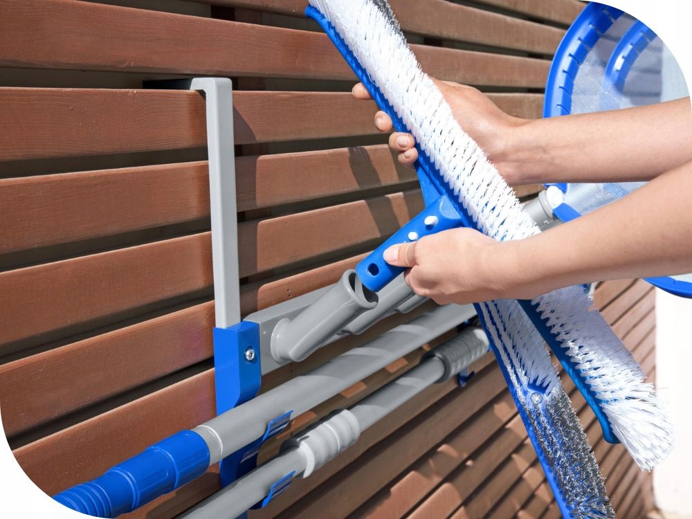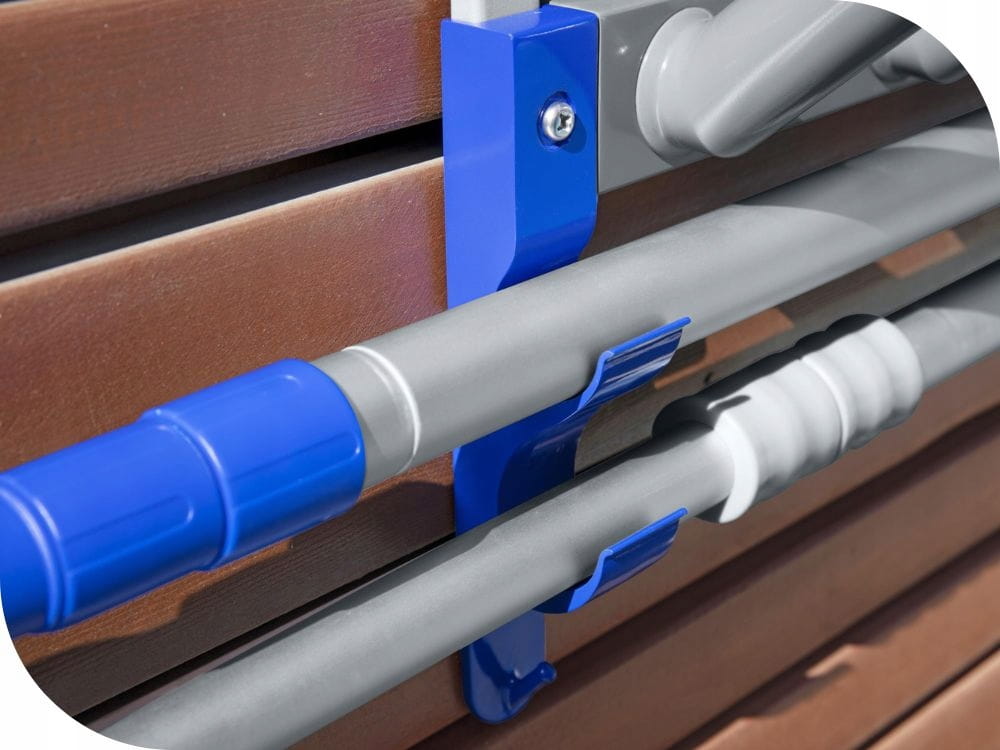 - Proste rozwiązanie do przechowywania sprzętu do konserwacji basenu w jednym wygodnym miejscu z łatwym dostępem